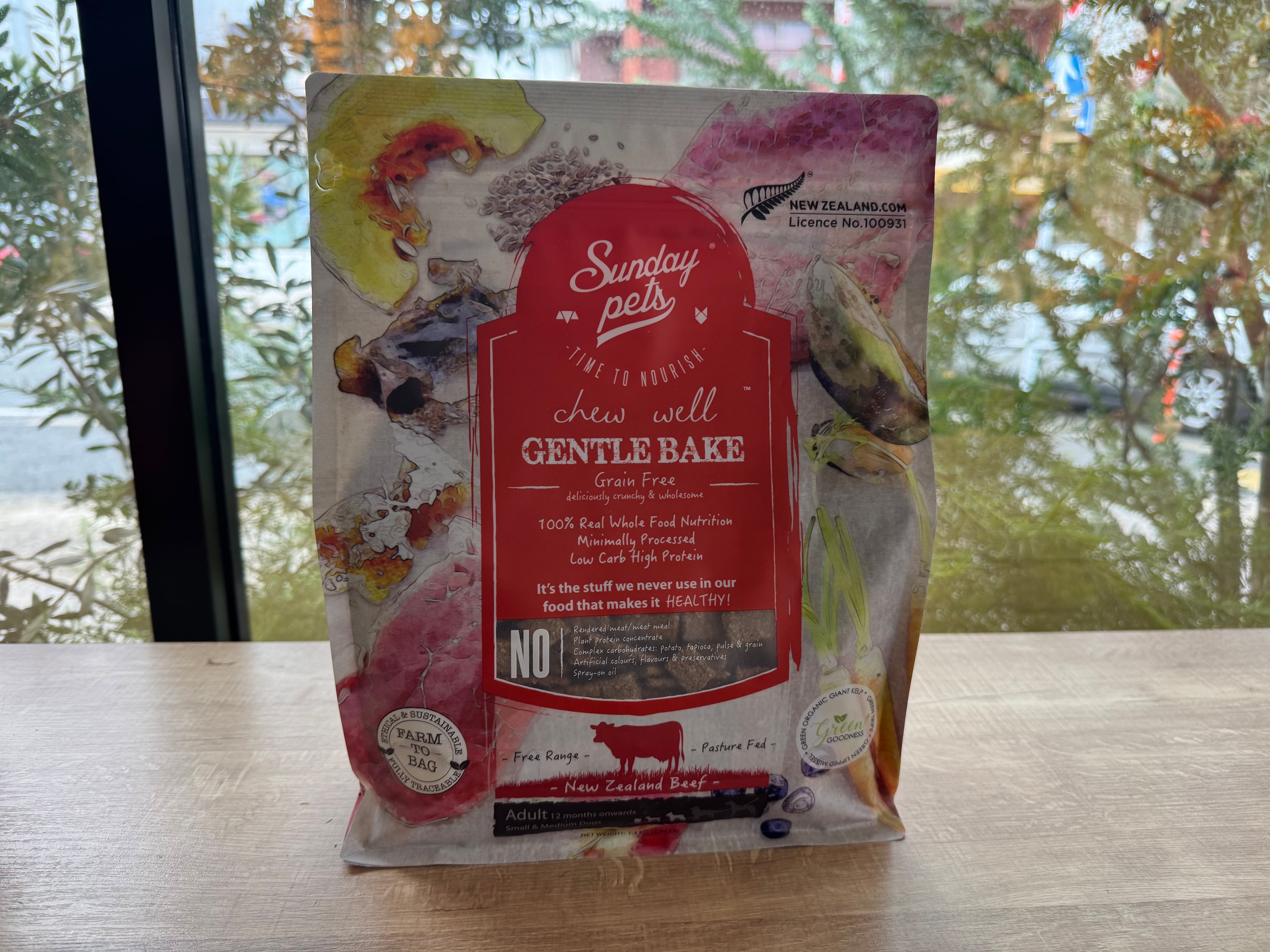 ビーフ64%(牛肉、ビーフトライプ*、ビーフレバー*、ビーフキドニー*、ビーフハート*)、野菜34.9%(カボチャ、亜麻仁、ニンジン、有機オオウキモ(海藻))、緑イ貝0.2%、ブルーベリー0.2%、マヌカハニー0.1%、有機リンゴ酢0.1% *季節により使用します。